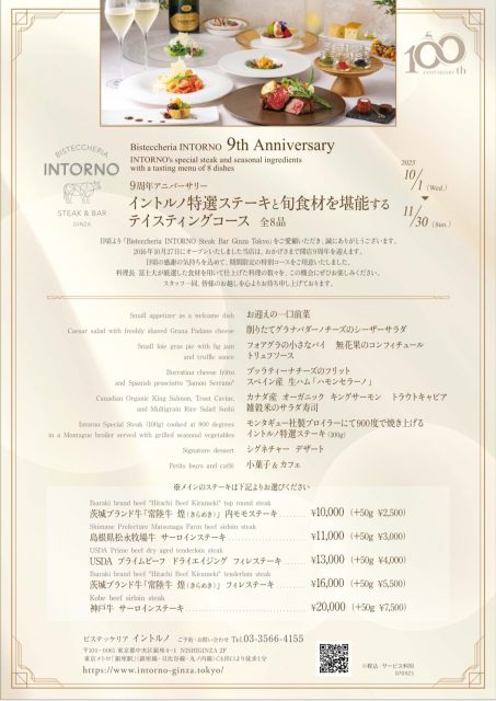 【9th Anniversary イントルノ特選ステーキと旬食材を堪能するテイスティングコース10/1(水)~11/30(日)】
